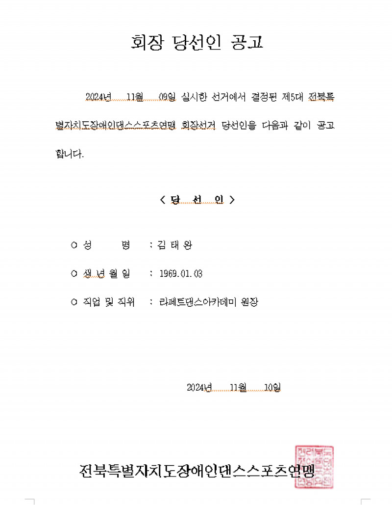 전북특별자치도장애인댄스스포츠연맹 제05대 회장 당선인 공고 전북특별자치도장애인댄스스포츠… 전북 0 488 2024.11.10 13:40 전북특별자치도장애인댄스스포츠연맹 제05대 회장 당선인 공고.