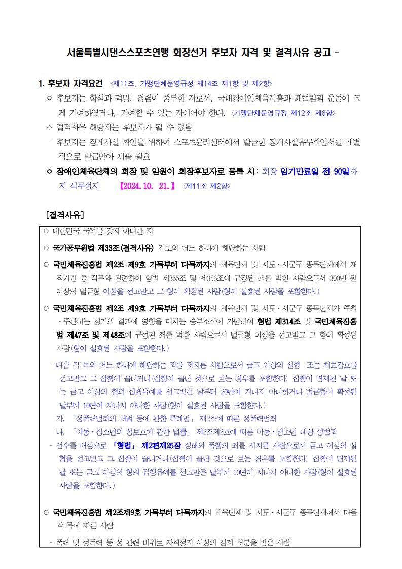 서울특별시장애인댄스스포츠연맹 회장 후보자 자격 및 결격 사유 sdsfd 서울 0 416 2024.10.28 12:39 서울특별시장애인댄스스포츠연맹 제5회 회장 후보자 자격 및 결격 사유