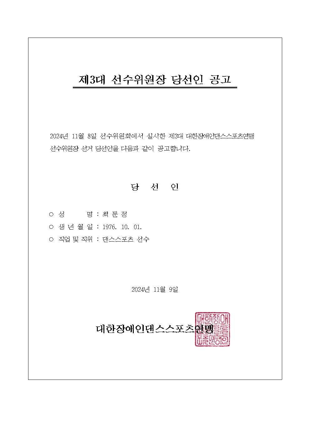 대한장애인댄스스포츠연맹 제3대 선수위원회 위원장 당선인 공고