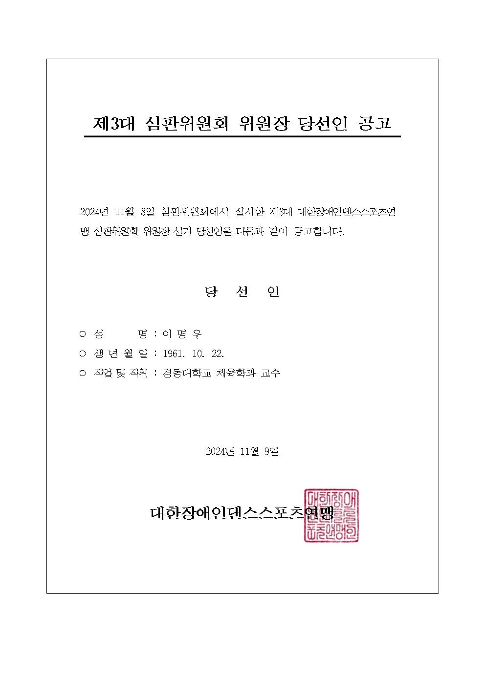 대한장애인댄스스포츠연맹 제3대 심판위원회 위원장 당선인 공고