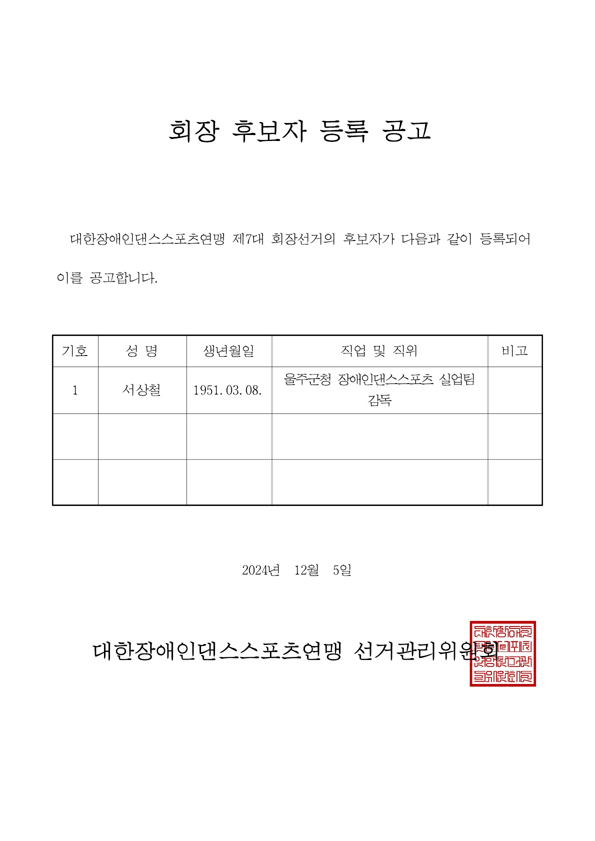 대한장애인댄스스포츠연맹 제7대 회장 후보자 등록 공고
