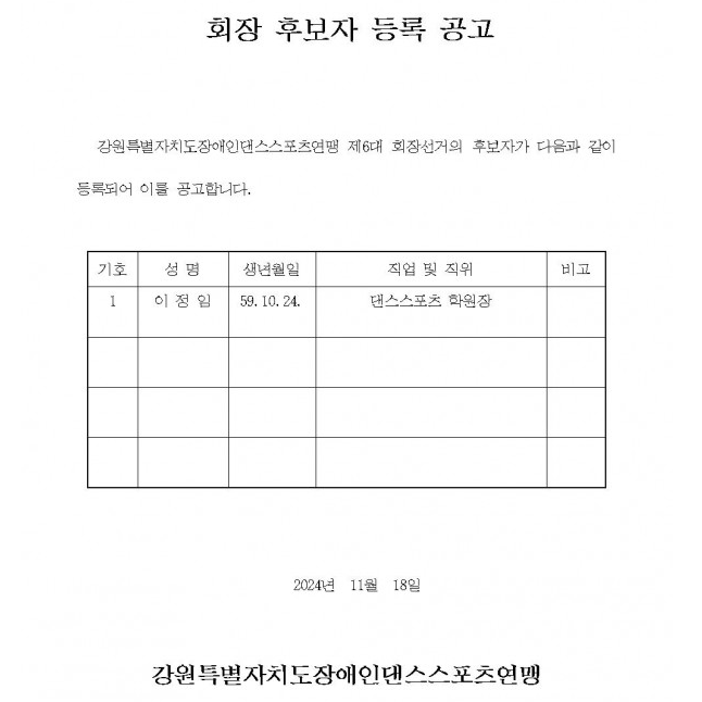 강원특별자치도장애인댄스스포츠연맹 제6대 회장 후보자 등록 공고