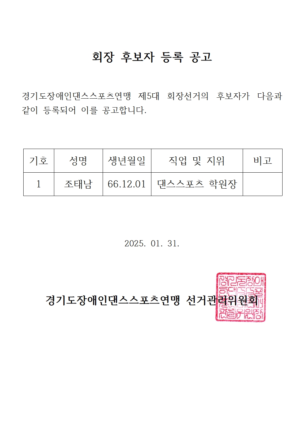 회장 후보자 등록 공고