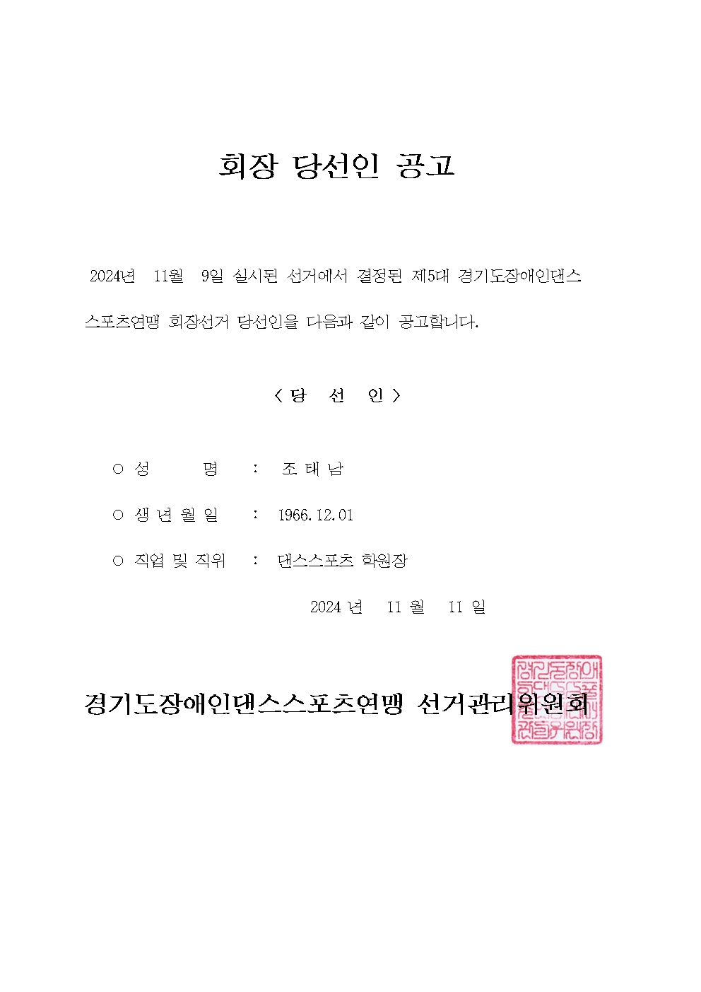 경기도장애인댄스스포츠연맹 제5대 회장 당선자 공고