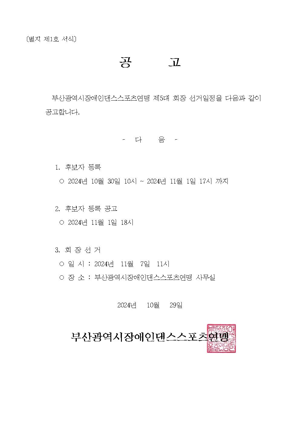 부산광역시장애인댄스스포츠연맹 제5대 회장 선거일정 공고