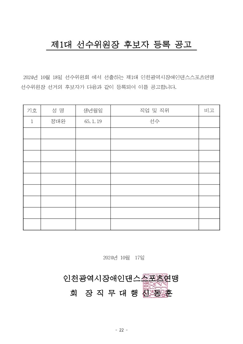 인천광역시장애인댄스스포츠연맹 제1대 선수위원장 후보자 등록 공고