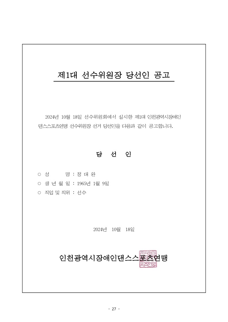 인천광역시장애인댄스스포츠연맹 제1대 선수위원장 당선인 공고