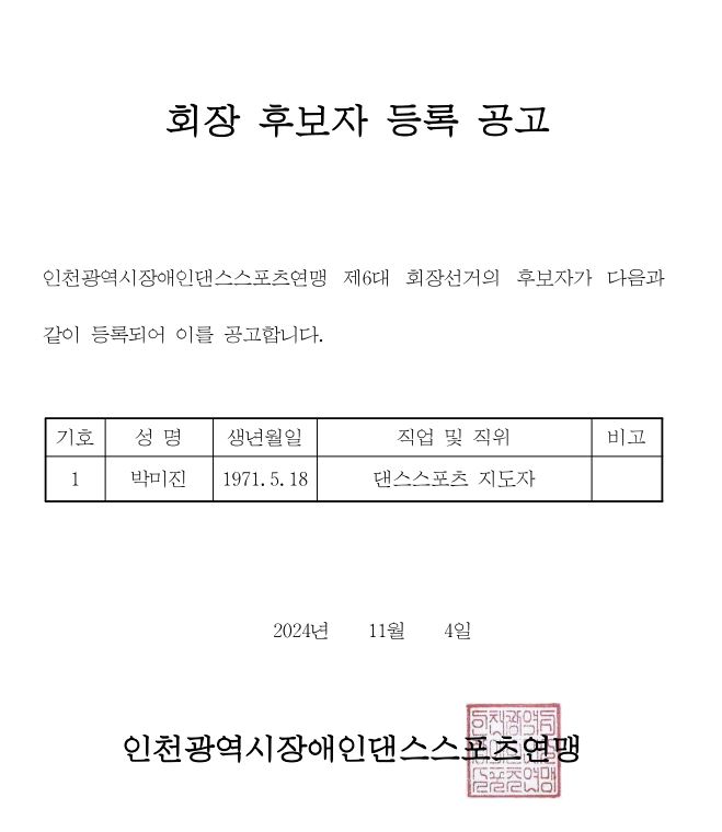 인천광역시장애인댄스스포츠연맹 제6대 회장 후보자 등록공고
