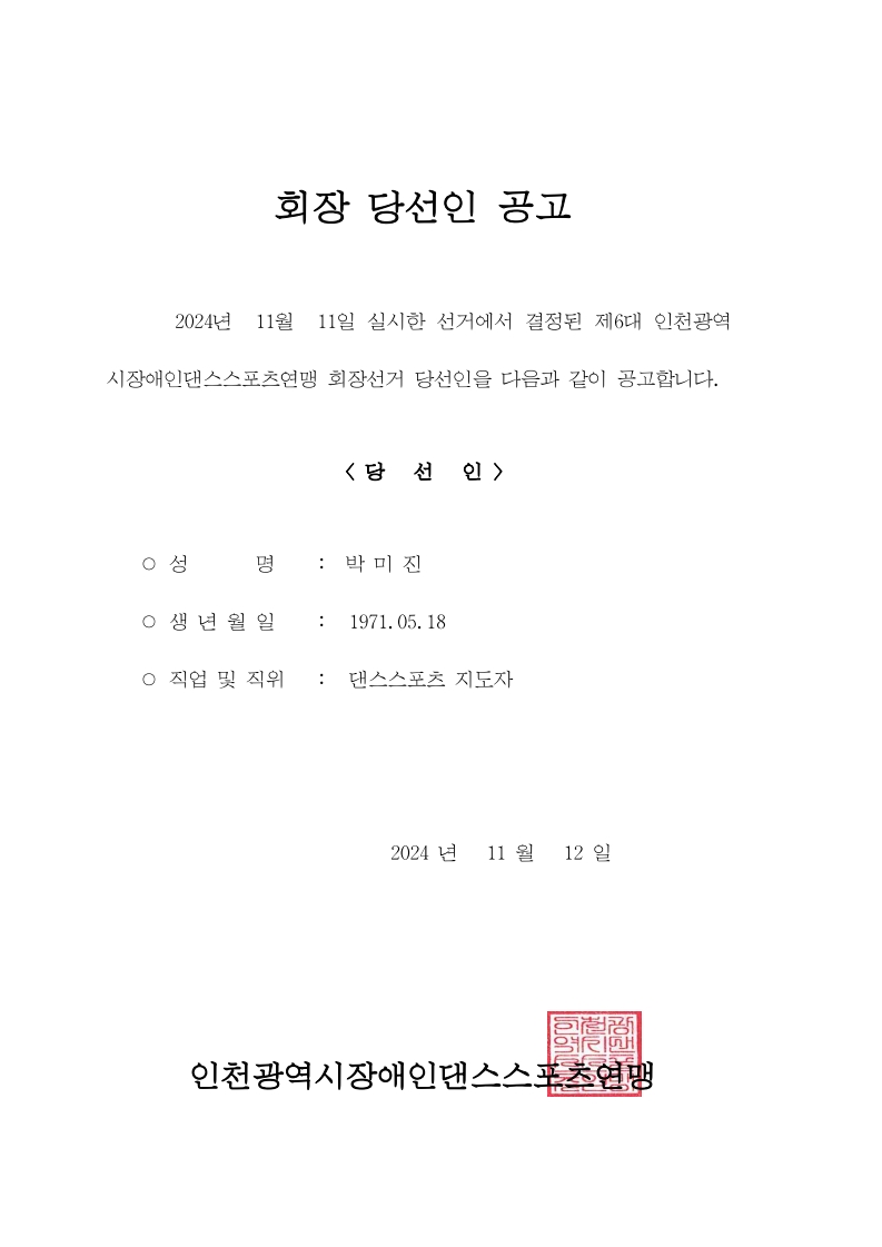 인천광역시댄스스포츠연맹 제6대 회장 당선인 공고